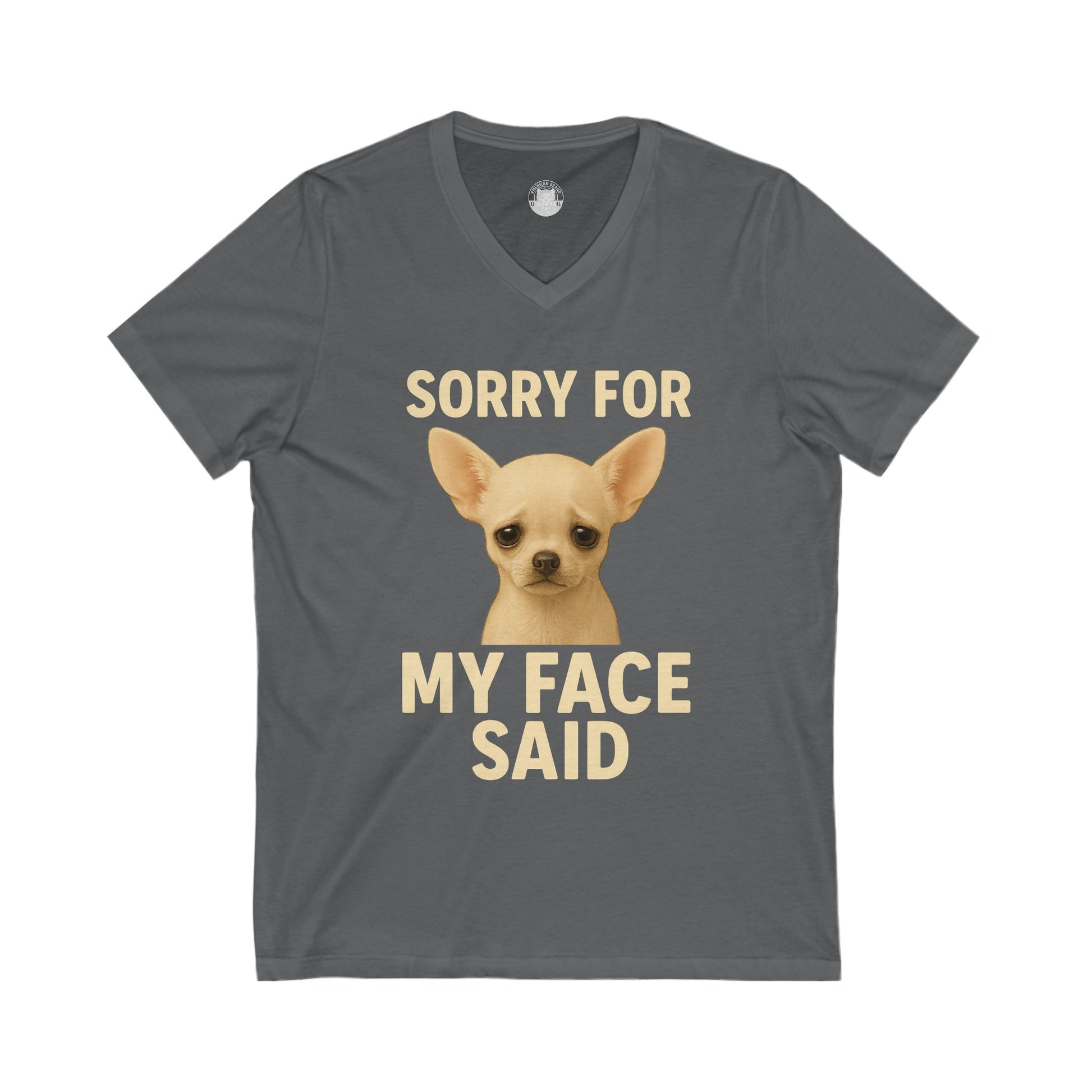 A trendy and stylish unisex jersey V-neck tee featuring a fun 'Sorry For What My Fave Said' chihuahua neck design. This lightweight and comfortable t-shirt is perfect for casual wear and makes a great conversation starter for dog lovers. Ideal for adults looking for a versatile and humorous addition to their wardrobe, this t-shirt is perfect for everyday wear or special occasions.